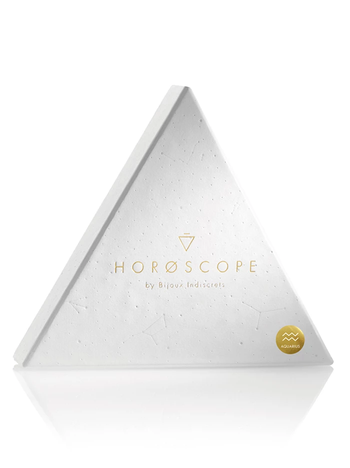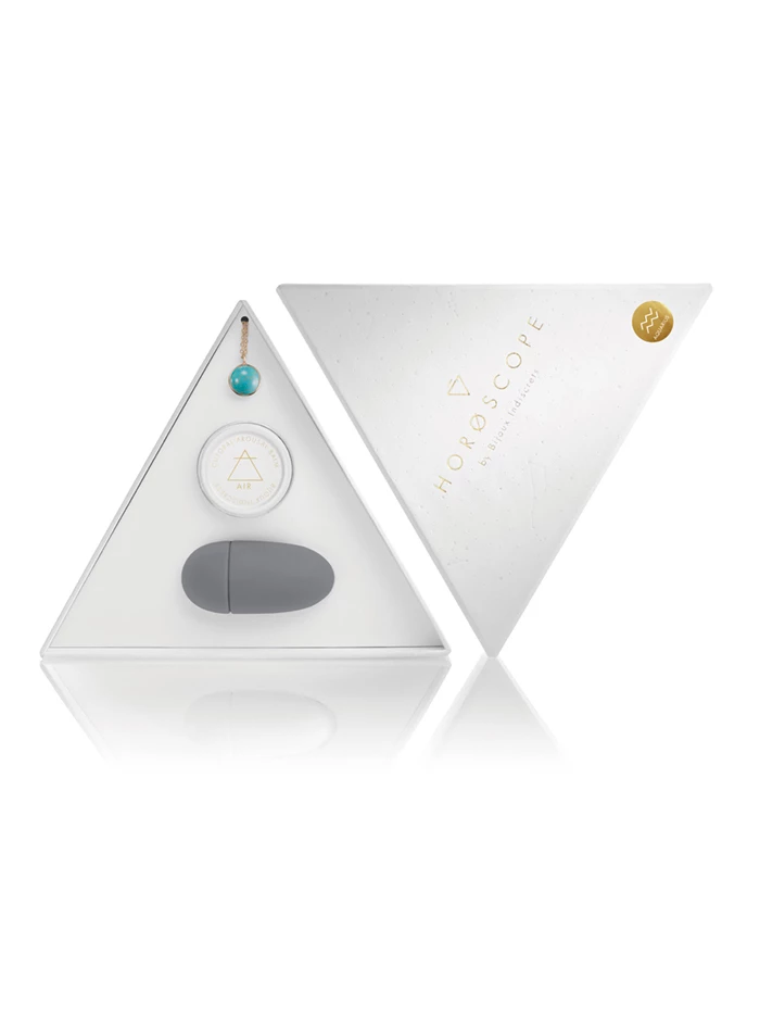 Explore astrology for unique insights about your personality and those of potential partnersâand let this knowledge inform your embrace of your own eroticism too! These Horoscope by Bijoux Indiscrets kits are the perfect gift (for yourself or someone you cherish) to help explore the depths and starry heights of your spirit and sexual energy, whether you are learning about your best solo pleasures or going deep with a lover. Each lovely triangular box is embossed with constellations and includes an informational insert about the traits attributable to your sign; a gemstone necklace matching your signâs energies and personality specifics; a grey battery-operated silicone finger vibe; and a .28oz tin of warming orgasm balm to intensify clitoral sensations, crafted with botanicals whose fragrance correlate to your Water, Air, Fire, or Earth signs. For external use only, this balm stimulates blood flow; its warming effect calls attention to the clitoris and your pleasure.