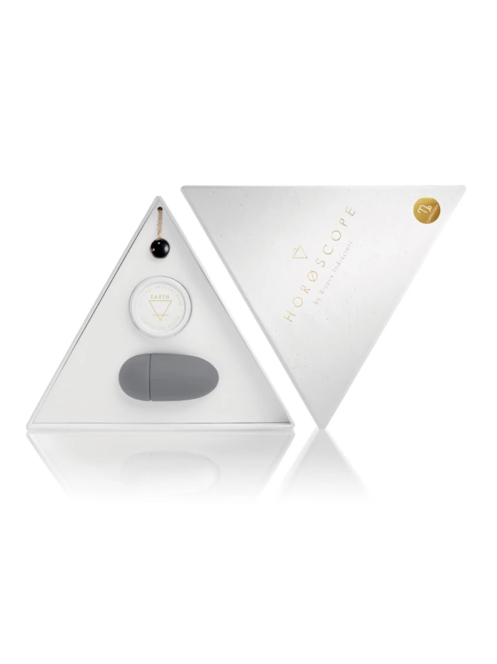 Explore astrology for unique insights about your personality and those of potential partners—and let this knowledge inform your embrace of your own eroticism too! These Horoscope by Bijoux Indiscrets kits are the perfect gift (for yourself or someone you cherish) to help explore the depths and starry heights of your spirit and sexual energy, whether you are learning about your best solo pleasures or going deep with a lover. Each lovely triangular box is embossed with constellations and includes an informational insert about the traits attributable to your sign; a gemstone necklace matching your sign’s energies and personality specifics; a grey battery-operated silicone finger vibe; and a .28oz tin of warming orgasm balm to intensify clitoral sensations, crafted with botanicals whose fragrance correlate to your Water, Air, Fire, or Earth signs. For external use only, this balm stimulates blood flow; its warming effect calls attention to the clitoris and your pleasure.
