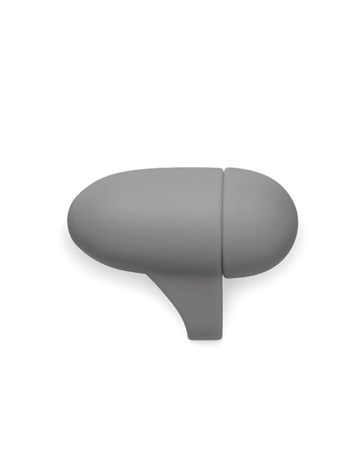 Grey silicone. Power up with three watch batteries (included). Clean with mild soap and water. One year warranty. 10 vibration settings. 2.5” x 1.25”.