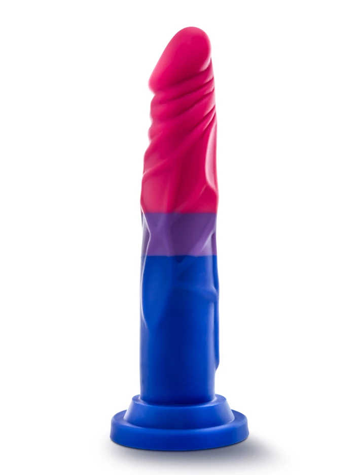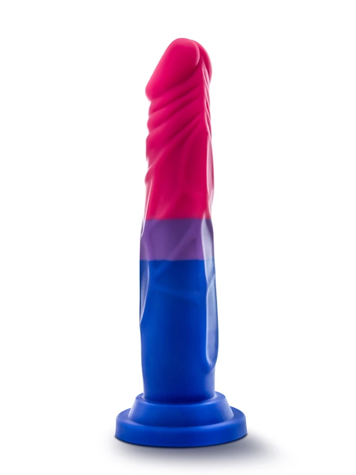 Harness your pride with a suction-base color-banded silicone dildo in the pink, purple and blue of the bisexual flag. The suction cup that adheres easily to smooth flat surfaces, so you can enjoy hands-free penetration as well as fantasy threesome scenarios. Designed with a straight, slim, vein-textured shaft featuring a realistic head that tapers at the tip for easy insertion; the texturing increases towards the head so you can enjoy increased stimulation during penetration. Clean with mild soap and toy cleanser or boil to sanitize. 5-Year warranty.