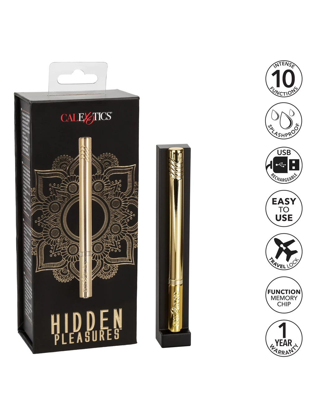 Go all out with the discreet bullet vibe that stands apart from the crowd, but doesn’t make a scene. Hidden Pleasures is a compact metallic vibrator that packs 10 rumbling functions into a very miniature frame. Indistinguishable from most household electronics, this rechargeable vibe knows how to keep a secret. The single touch controls allow you to effortlessly filter through 10 pulsating modes, while the whisper quiet motor keeps your playtime incognito.