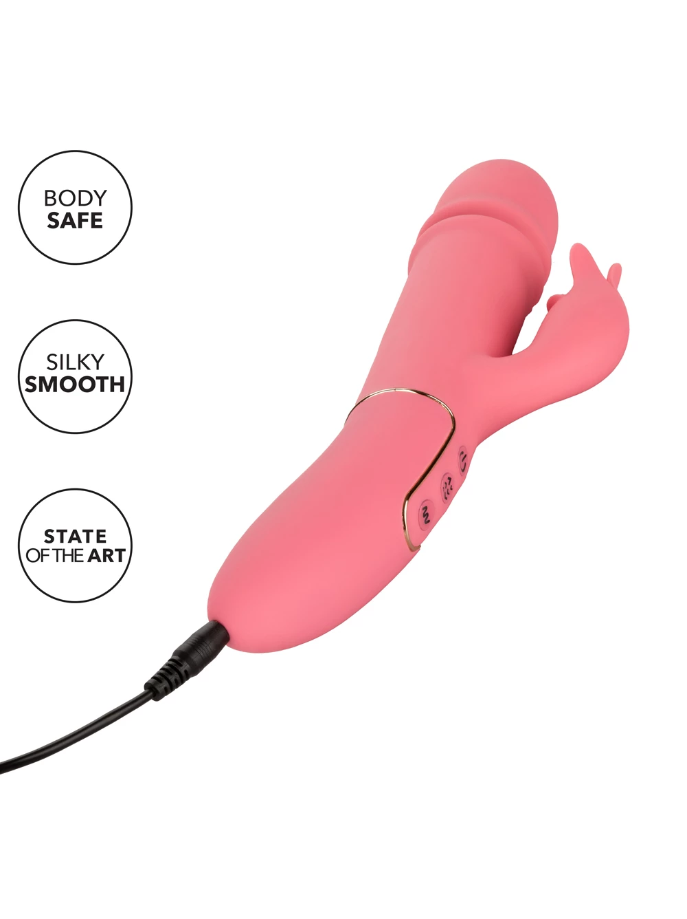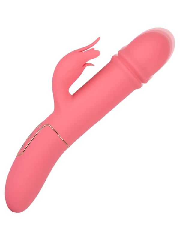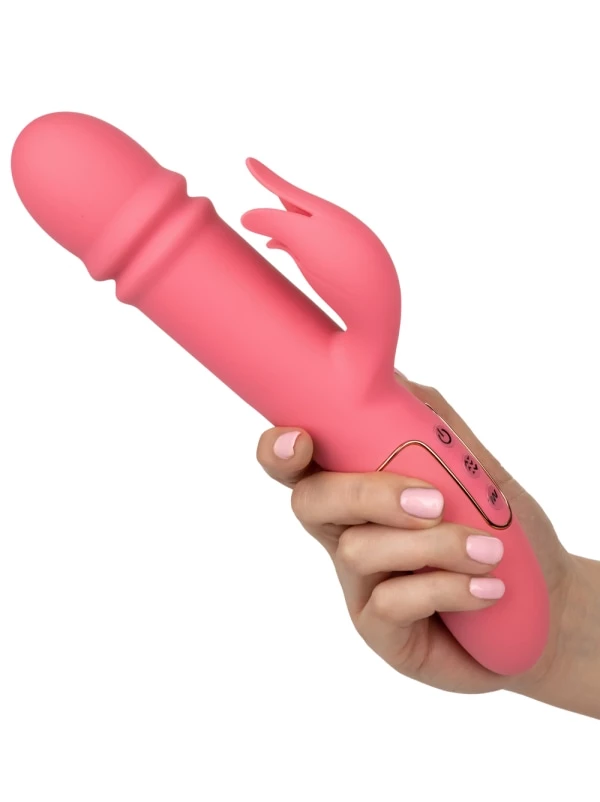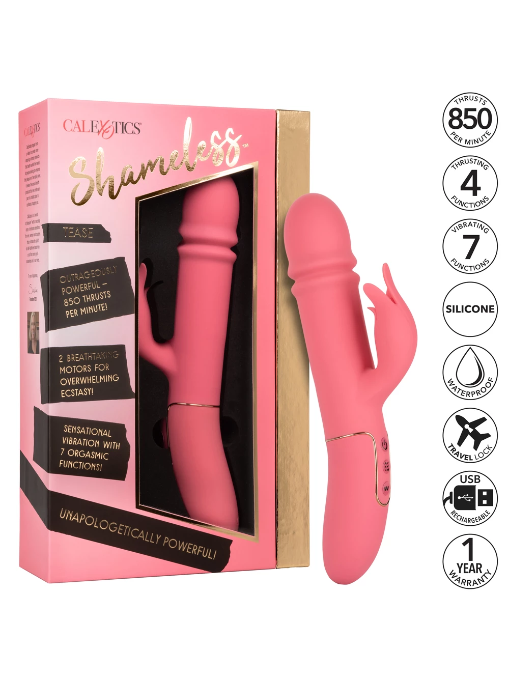 Who could resist the allure of a sex machine that fits in the palm of your hand? CalEx’s line of Shameless thrusters are powerful, submersible, and equipped with four stimulating up-and-down motions for you to explore. The Shameless Tease is ready to work–with up to 850 thrusts per minute! Featuring two motors and a flower-like vibrating external stimulator–compared with the Shameless Seducer, the Tease’s external nub is positioned further from the shaft. The Tease features a slight ergonomic curve and a softer-than-usual silicone shaft that is topped with a bulbous tip that is great for G-spot, prostate or clitoral stimulation. While the thrusting might seem overwhelming in a firmer toy, the Tease’s soft silicone and easy-to-use three button controls make this thruster approachable and quite satisfying. Tease’s shaft is made of waterproof silicone and the handle is ABS plastic with gold tone detailing; its compact design and travel lock make it a perfect toy to bring on the road. The external piece features three settings: Vibration, Pulsation and Escalation. Rechargeable; completely charges in 120 minutes for 50 minutes of play on high, 70 minutes on low.