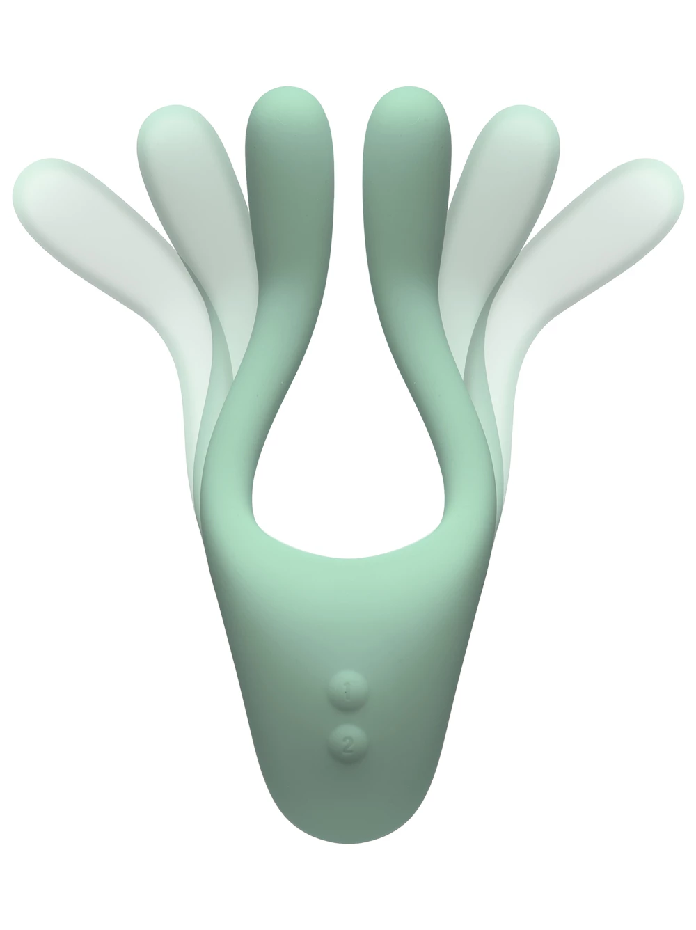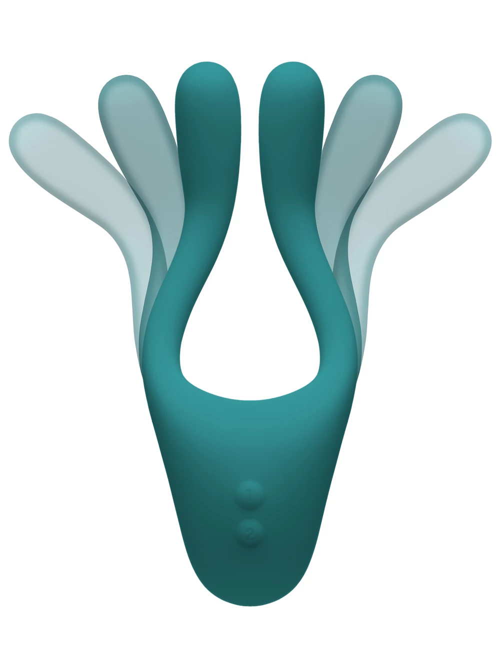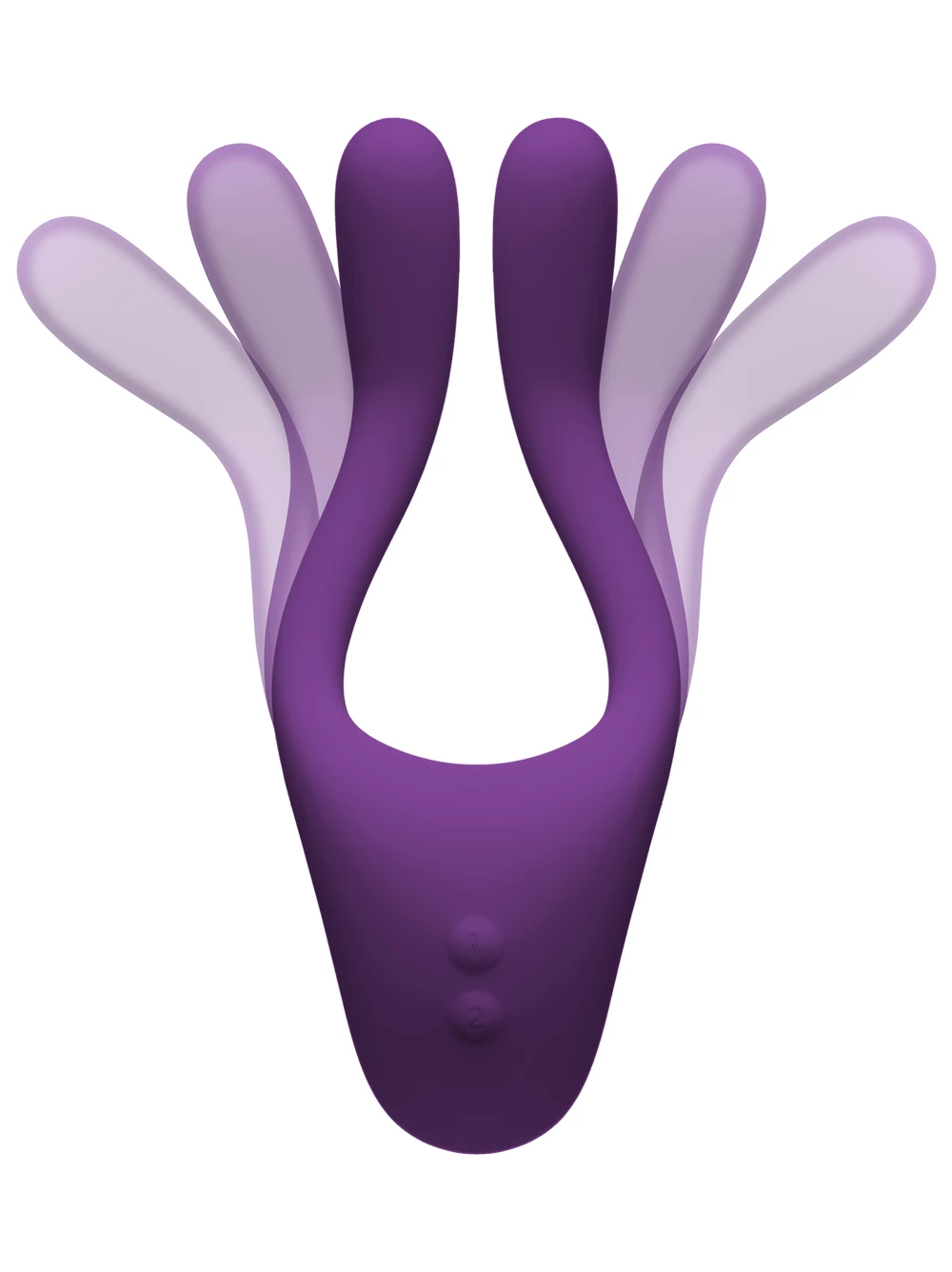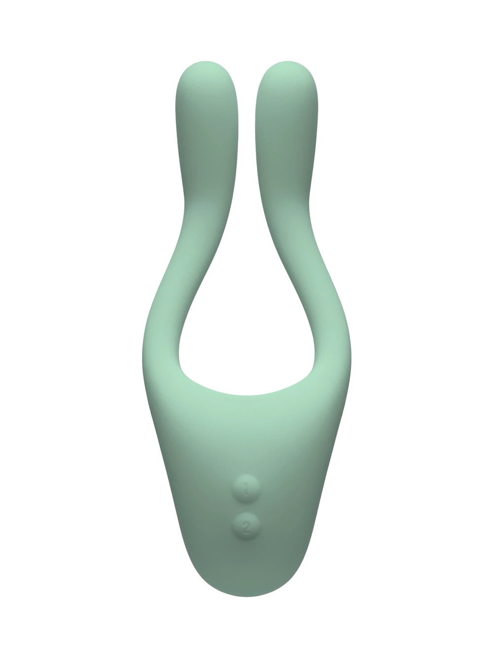 The Tryst v2 features an award-winning design that allows for a wide variety of ways to incorporate the pleasures of vibration into your good times. Rechargeable, with a multi-functional shape whose use is limited only by your imagination. Tryst v2 is equally at home in solo or partnered play: try stimulating labia, clitoris, nipples, stroking the shaft of the penis, ball play—or even internal pleasure! The arms are versatile enough that they can be comfortably worn on the penis during intercourse! This water resistant, silicone vibe features separate controls for the base and the two curved arms, plus 3 speeds and 10 functions. Featuring a wireless remote control, the Tryst allows you to change up the beat without interrupting the fun.