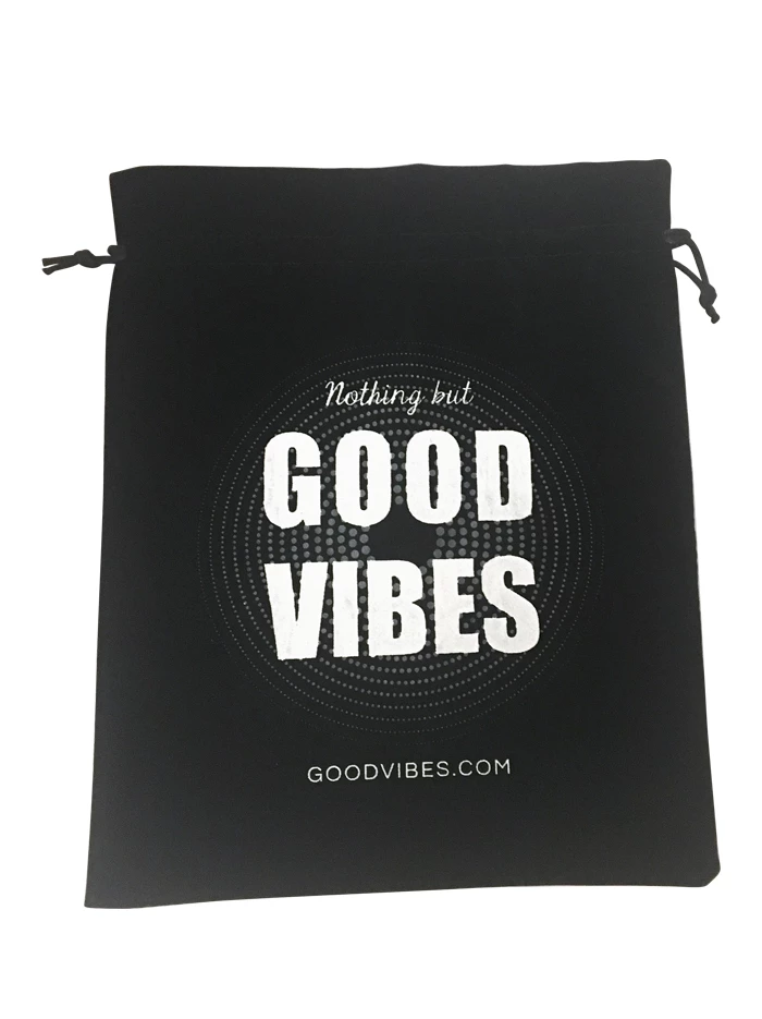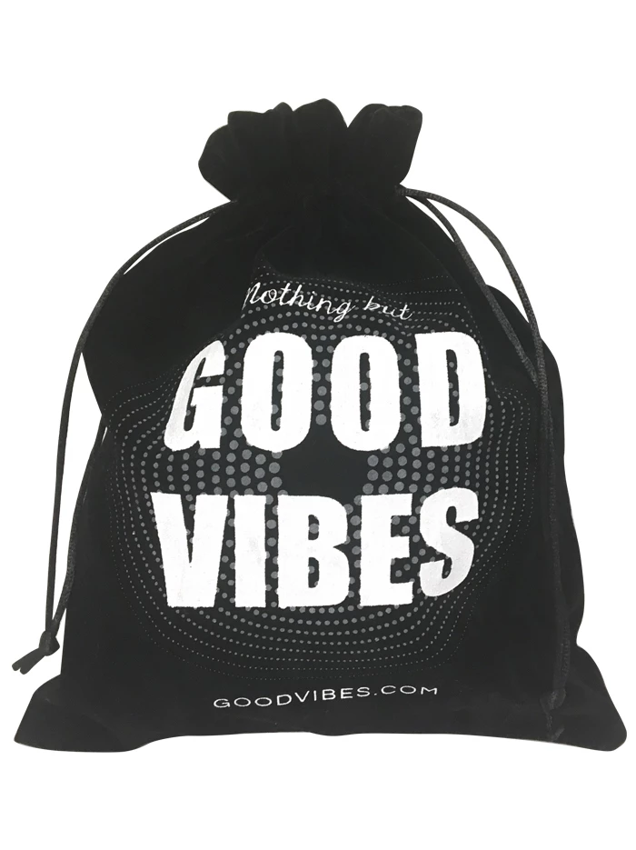 There’ll be “Nothing but Good Vibes” in your life when you carry this fun velvety-soft drawstring storage bag. We created this cute carry-all sized pouch so you’ll always have a handy stash bag ready for your intimate items. Whether you’re on the go for date night or using it as a travel bag for your must-bring vibe, lube or other items, it’s useful as can be. It’s also perfect for tucking away your best-loved toys when you’re not using them–keep your precious items clean and in one place. It makes a great gift, too–give it as-is, or fill it up with sexy little treats for your favorite person!