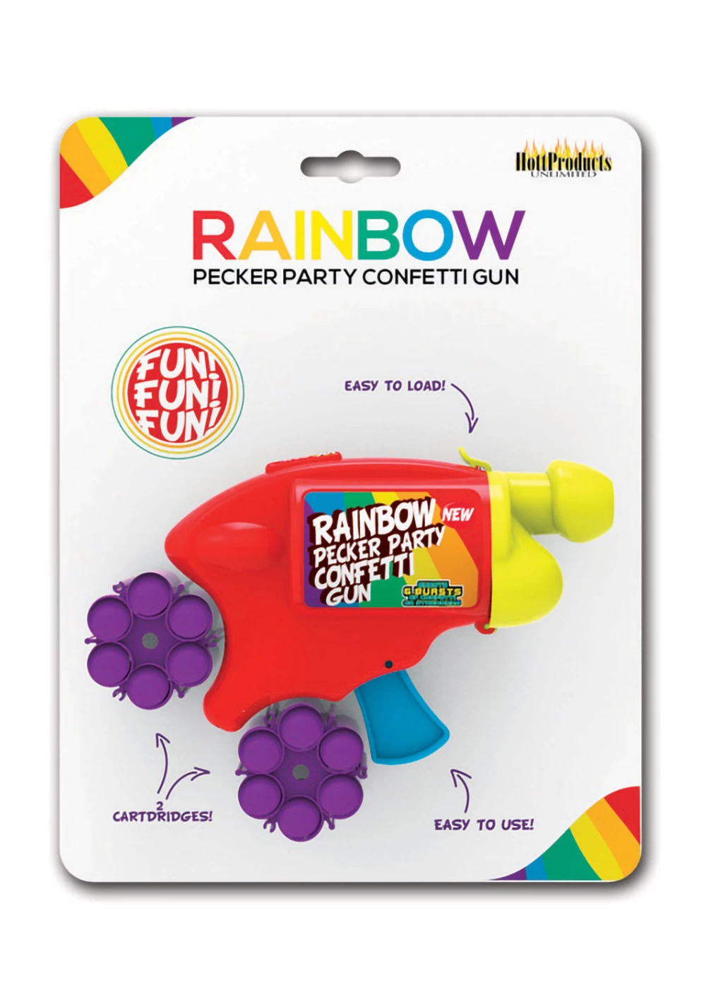 Make your next party a real “Blast” as you Blast out a steady stream of Pecker Confetti… with the Rainbow Pecker Party Confetti Gun! Shiny Rainbow Pecker Confetti will rain down in a hail of Rainbow Confetti Fun!