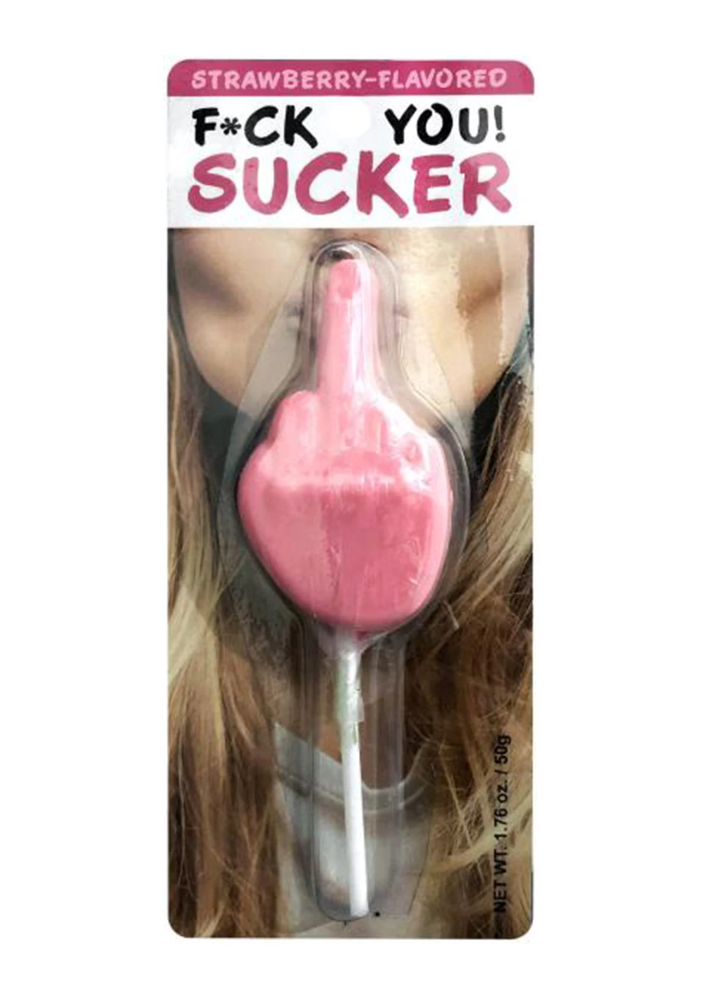 Let other people know how you really feel about them with your strawberry-flavored Fuck You! Sucker. Includes 1 1.76 oz (50 gram) sucker. 80 calories per sucker.