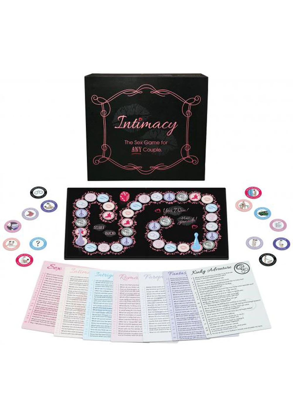 Includes: A game board, 1 dice, 2 game markers, 14 sexual reward coins, and 2 question cards for each of the 7 categories – Sex, Intimacy, Intrigue, Romance, Foreplay, Fantasy, and Kinky Adventures.