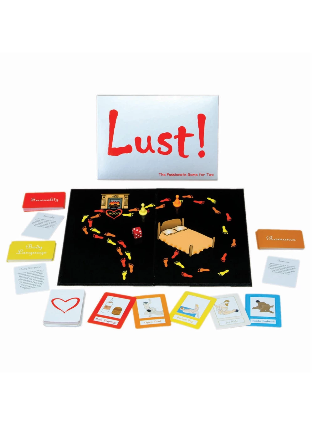 Lust is a game for lovers that allows you to explore both romantic and physical intimacy with your partner. You and your partner begin by placing your markers at the start of the game board. As you land on various footstep game spaces, you select cards that have you and your lover acting out or sharing various romantic and sexual indulgences with each other. While venturing along the path, you also earn Love-Making Cards. These cards explicitly illustrate either a foreplay activity or a sexual position. You and your partner use these cards to build and agree on a sexual fantasy. The first person to reach the bed at the end of the path takes the collected Love-Making Cards and initiates the love-making techniques depicted on the cards. Each game ends with a unique love-making experience because there are over 30,000 possibilities within the Love-Making Cards. Game comes with game board, 20 Romance cards, 20 Sensuality cards, 20 Body Language cards, 40 Love-Making cards, 2 game markers, 1 die, and game rules. Note: This game is appropriate for adults only.