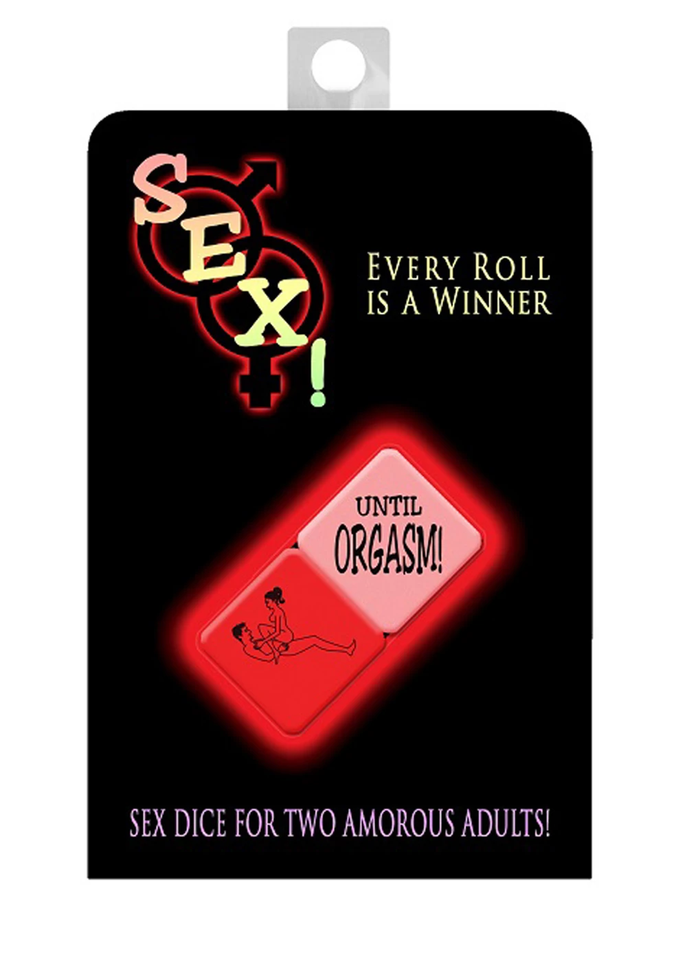 Sex dice for two amorous adults! Begin by one of you rolling the dice. The red die instructs you what to do and the pink die determines how long you do it. The roller decides who assumes each position.