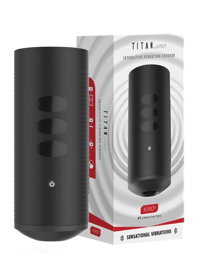 Enjoy Kiiroo Titan along with 1500 tokens to use on FeelPornStars.com–you can use the Titan immediately with adult content! Play with content made just for Kiiroo toys by stars like Asa Akira, Bobbi Eden, Jessica Drake, Lisa Ann, Romi Rain and Tanya Tate. You’ll have access to over 4000 titles! This smart, lightweight handheld interactive penis stroker uses Kiiroo technology and the FeelConnect app to pair up with other compatible interactive devices for connected pleasure. This model can be used with or without interactive content – it’s a special edition that connects to 2D and VR interactive videos, but it’s also a superior stroker that you can enjoy in either mode. Plenty of sensation awaits whether you use the app or fly solo–the unit includes nine vibrating bullets and a real-feel sleeve, and three control pads located on the side allow the user to experience the sensations generated by a range of modes, two manual and four automatic. (See the graphics below for more detail.) Turn Titan on by pressing the power button for two seconds – quick vibration will indicate it’s ready to play. Now you can connect to the FeelConnect app and pair with other compatible interactive devices, or sync to interactive content or a partner’s device for connected pleasure. The exterior is matte black, with gloss on the finger touch section. Maximum penis size recommended 7.48” (19 cm) length and 1.75” (4.5cm).