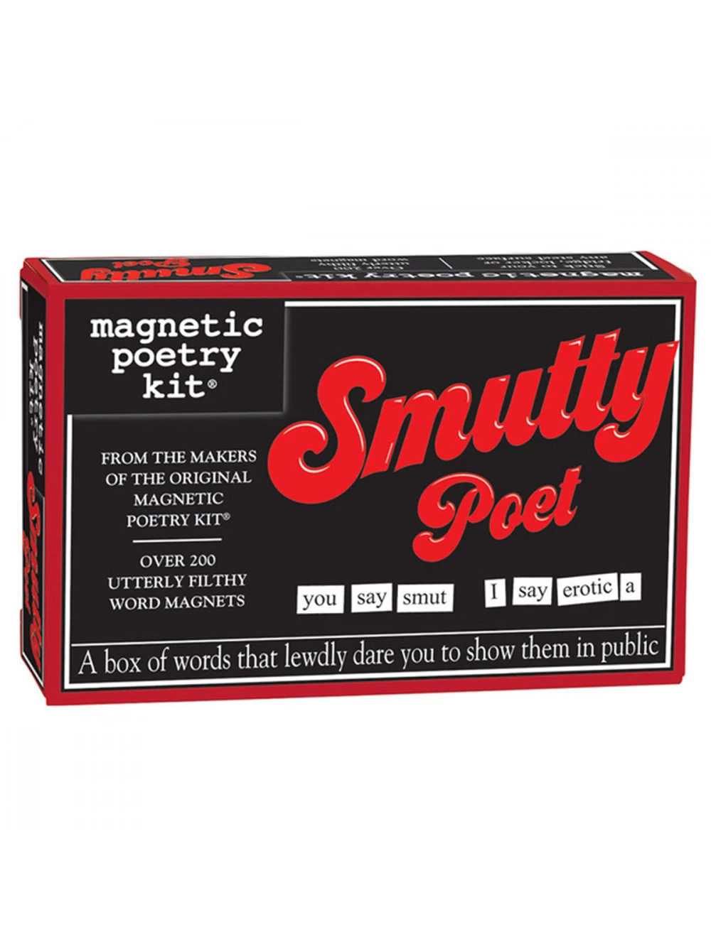 From the makers of the original Magnetic Poetry Kit, the Smutty Poet kit contains over 200 magnetized words and word fragments… install them on a fridge, file cabinet, locker door, cookie sheet, or any other steel surface, and watch the poetry emerge while arranging in countless fun ways! Contents: Over 200 Word Magnets