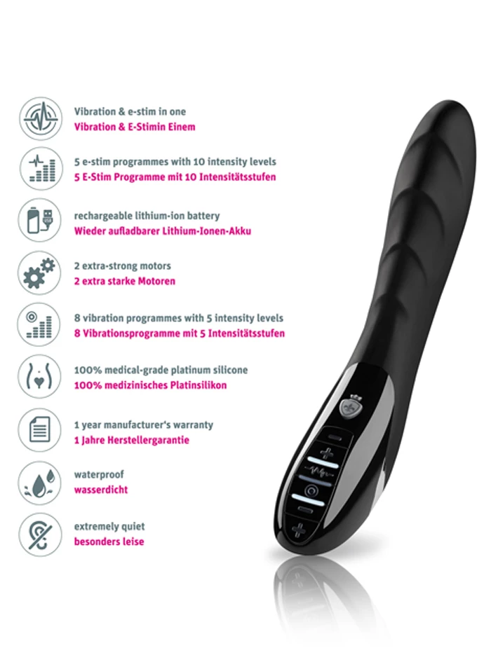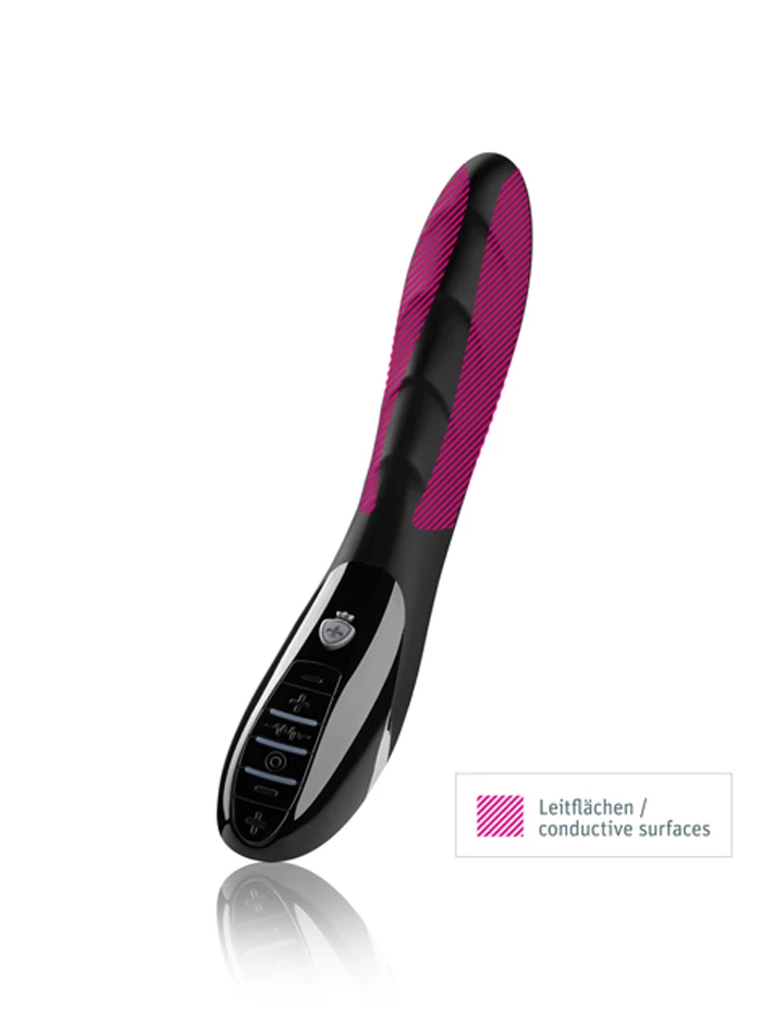 Mystim’s Estim toys are internal vibrators, ready to rock you with one motor in the base and another in the tip, that have a special superpower: they combine their wide range of vibrational patterns with electrical stimulation. E-stim, or electrosex, is the inclusion of electrical impulses during sexual activity–sensations can range from tingly and sensual to substantial intensity. E-stim devices and toys literally speak our body’s electrical language–whenever our bodies experience sensual stimuli, that sensation is transformed to an electrical impulse that travels to our brain as stimulation. And what stimulation electrosex can provide! These toys sport eight vibration patterns, five intensity levels and 10 electric settings–we’re talking serious sensate mathematics! Enjoy over 45 vibration options on their own, or combine them with the electric conductive surfaces that run along the outside shaft and power the toy’s e-stim capabilities. The intuitive controls are easy to navigate and allow for a wide range of variations. Perfect for couples looking to explore light bondage-with-sensation-play, or for a charged-up night on your own, electric stimulation is an excellent way to release endorphins and kick things up a notch.