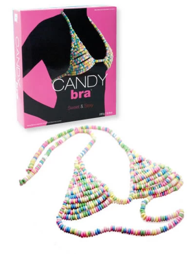 Show off your charms with this super-cute candy bra, then come closer to offer your honey some sugar! Elastic apparel is wearable up to 40″ bra size; candies are multi-colored and various flavors. Pair the bra with the Candy G-String for a sweet edible ensemble that’ll turn your partner into the luckiest one in the candy store!