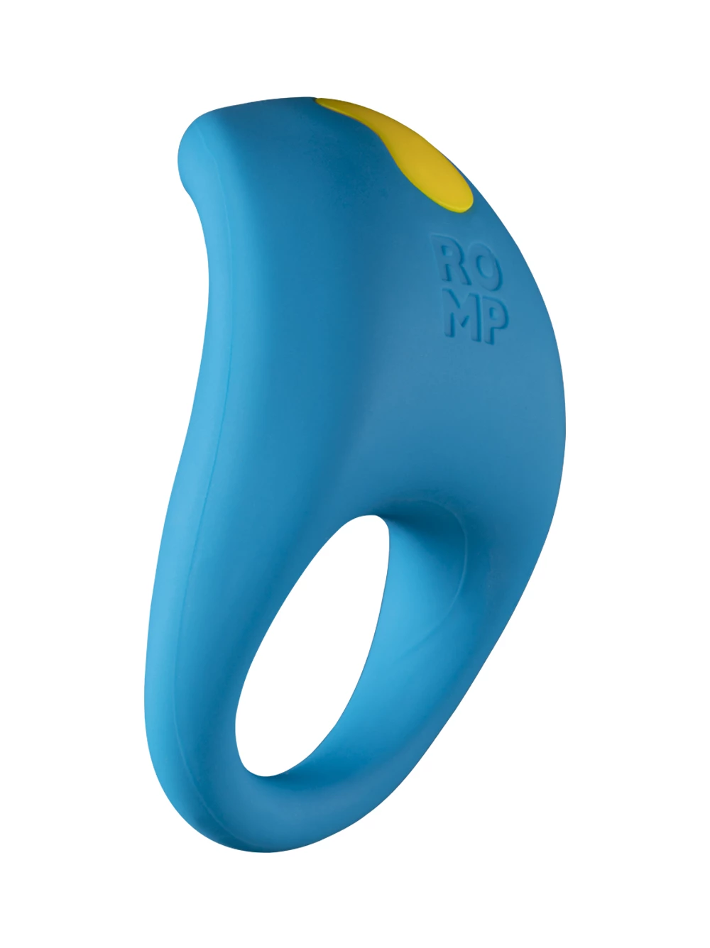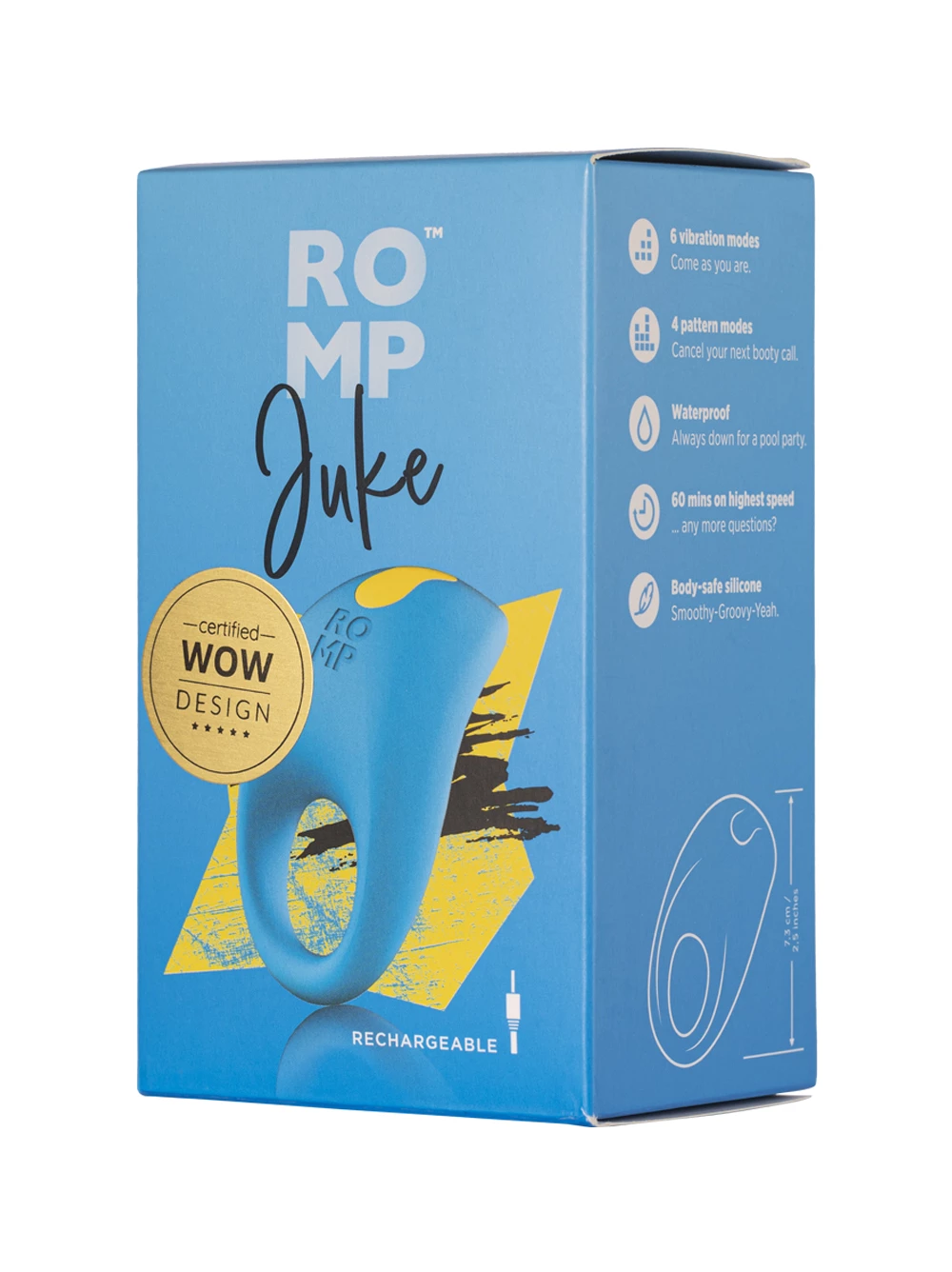 The Romp Juke is a waterproof, rechargeable penis ring designed with an extended top section for wider coverage–enjoy enhanced pressure and intensity, plus six vibration modes and four pulsation patterns. Its two control buttons are located on the top, which makes it easy to skip to the next vibration pattern when you’re ready to change up the beat! Ergonomically designed to fit comfortably on the body, its vertical motor placement lets you enjoy maximum sensation and contact both when used with a partner, nestled against the clitoris or testicles, or for solo use–wear it with the vibe facing downward for more direct testicle stimulation. Rechargeable–a one-hour charge yields an hour of play.