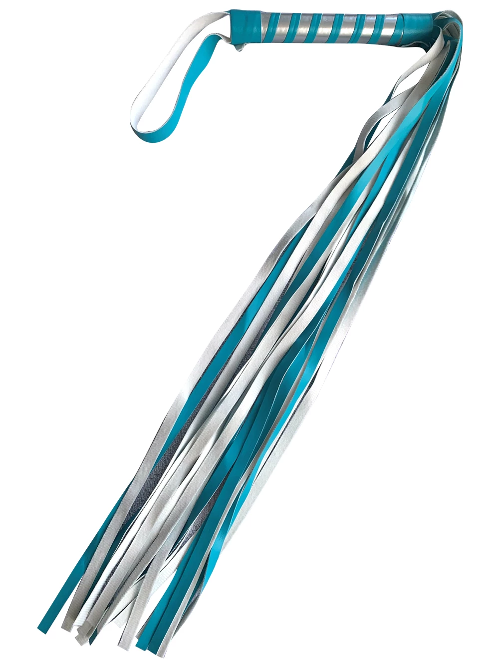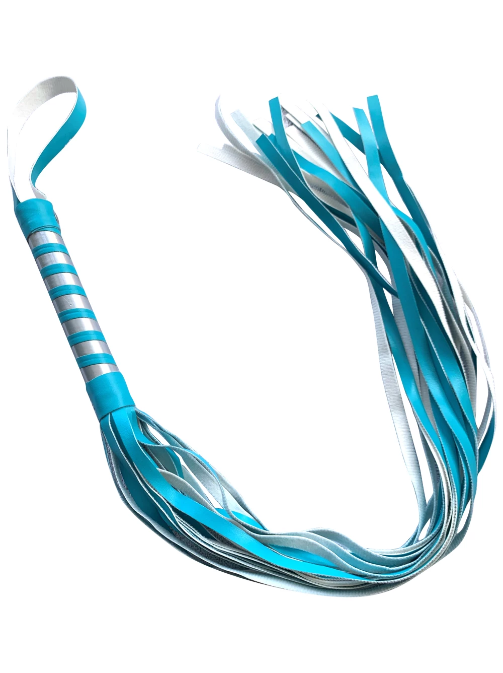 This colorful mini flogger will be a playful addition to your cosplay ensemble, sexy costume frolic, or simply for adding some prismatic flair to your BDSM collection. If you’re just starting out with impact play, it’s a great budget-friendly choice for those looking to try out light flogging without having to invest in premium leather gear. The flogger’s pretty outside tails are a playful blue; it’s inner tails are white, making a stylish two-tone look. It features an easy to grip handle with a loop on the end for hanging storage or wearing on a bondage belt.