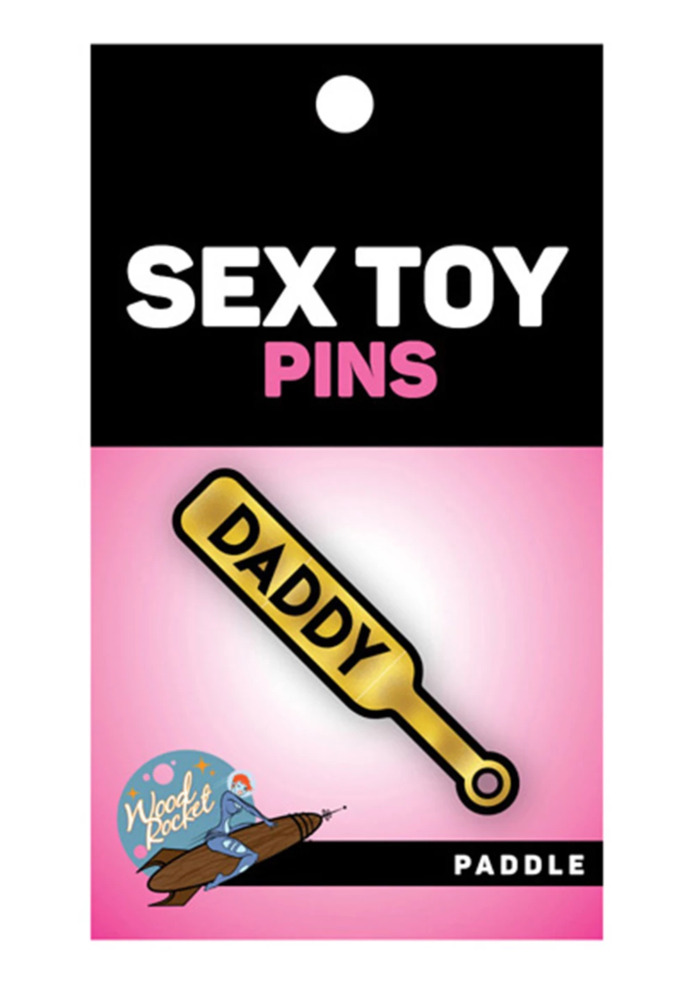 This fun soft enamel lapel pin by Wood Rocket is the perfect accessory. Wear your sex product pride! This paddle Sex Toy Pin is gold with black text and looks just like a fetish BDSM paddle that says Daddy but it’s tiny! Stick it on your hat or clothes or backpack or bag or purse it or give it as a gift! Please don’t stick it on your butt. It is sharp!