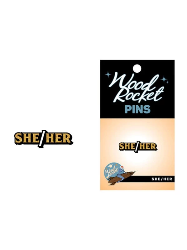This fun She/Her Pronoun soft enamel lapel pin by Wood Rocket is the perfect accessory to let others know right away what your preferred pronouns are, avoiding potential mistakes leading to dysmorphia or confusion. Stick it on a hat or clothes or backpack or bag or purse it or give it as a gift!